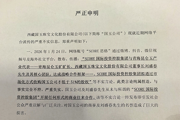 西藏国玉珠宝文化股份有限公司(以下简称“国玉公司”) 现就近期网络平台流传的...