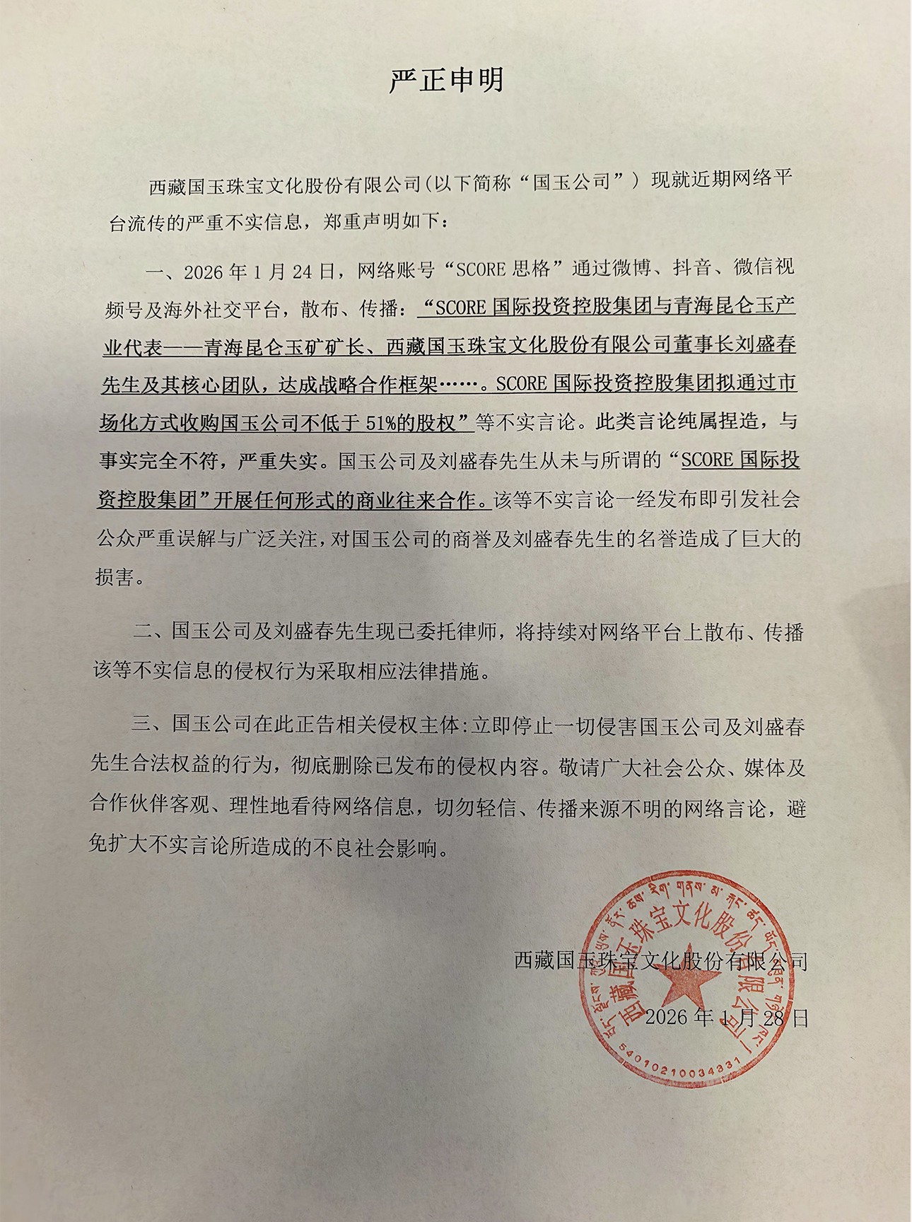 西藏国玉珠宝文化股份有限公司(以下简称“国玉公司”) 现就近期网络平台流传的严重不实信息,郑重声明